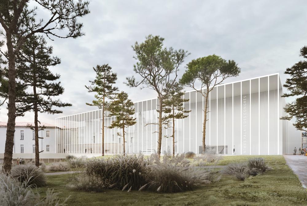The project is inspired by the verticality of the city’s architecture and by the fluid evanescence of music. It combines the main program in a unique elegant volume, defining a permeable green public space which opens up towards the city and towards the river.